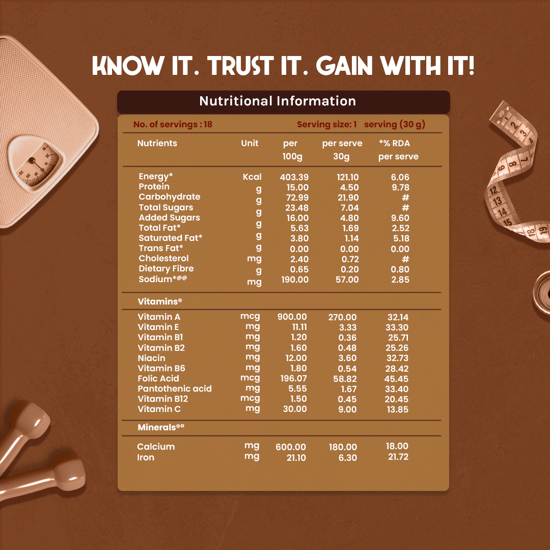 With a balanced formulation of easy-to-absorb and high-quality proteins, complex carbohydrates, fats, minerals, and vitamins this weight gain powder is packed with vital nutrients and energy to gain optimum weight.