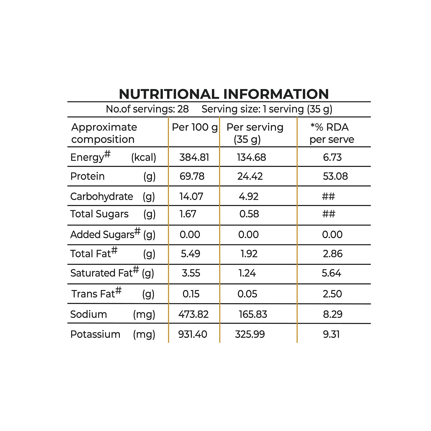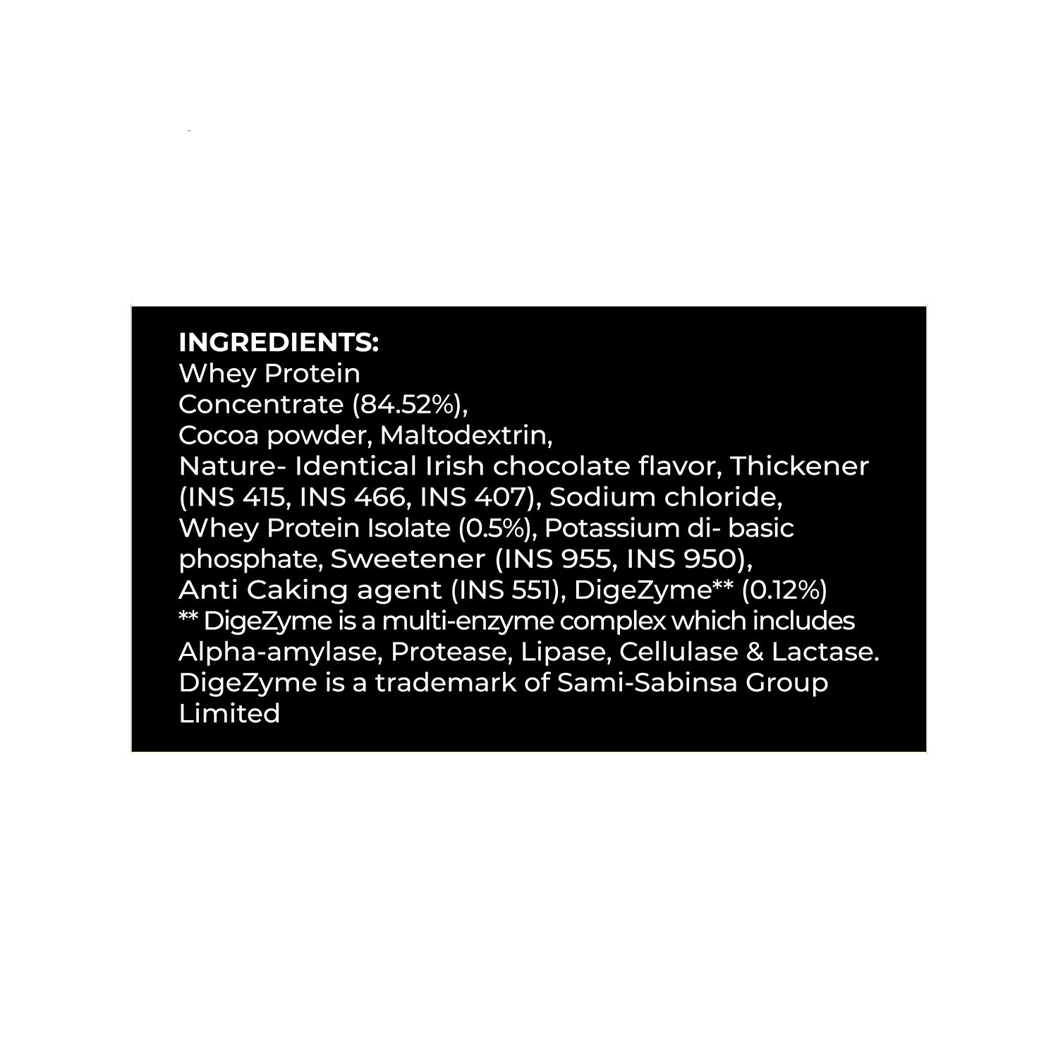 Whey Protein Concentrate (84.52%), Cocoa powder, Maltodextrin, Nature- Identical Irish chocolate flavor, Thickener (INS 415, INS 466, INS 407), Sodium chloride, Whey Protein Isolate (0.5%), Potassium di- basic phosphate, Sweetener (INS 955, INS 950), Anti Caking agent (INS 551), DigeZyme®* (0.12%) * DigeZyme® is a multi-enzyme complex which includes Alpha-amylase, Protease, Lipase, Cellulase & Lactase.