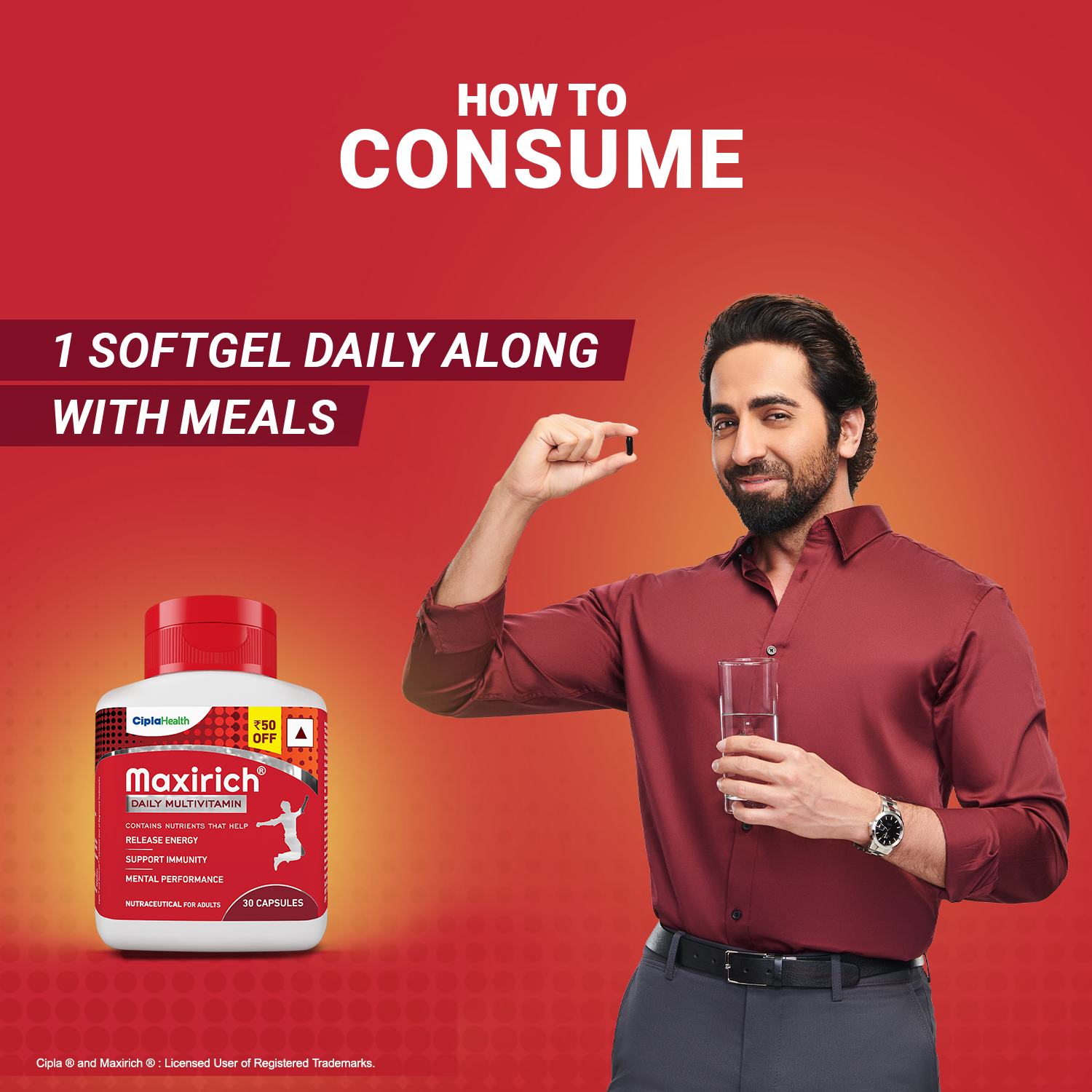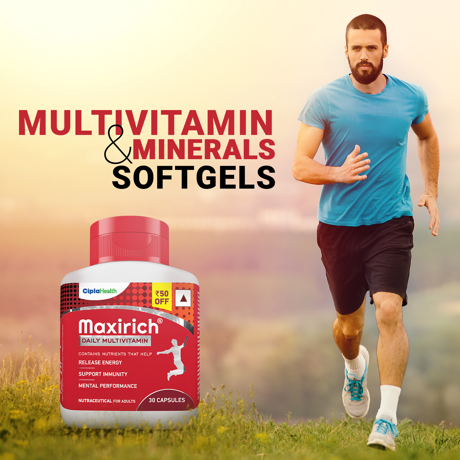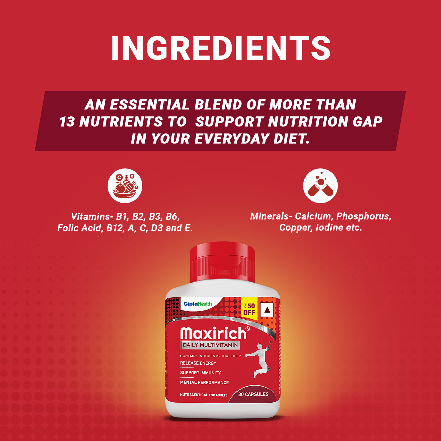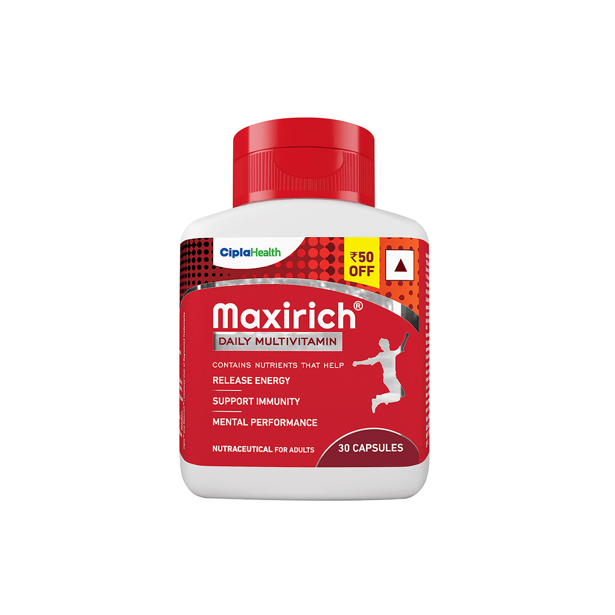 Maxirich Daily Multivitamin capsule helps build immunity, reduce tiredness and fatigue. This product should be taken along with varied diet.