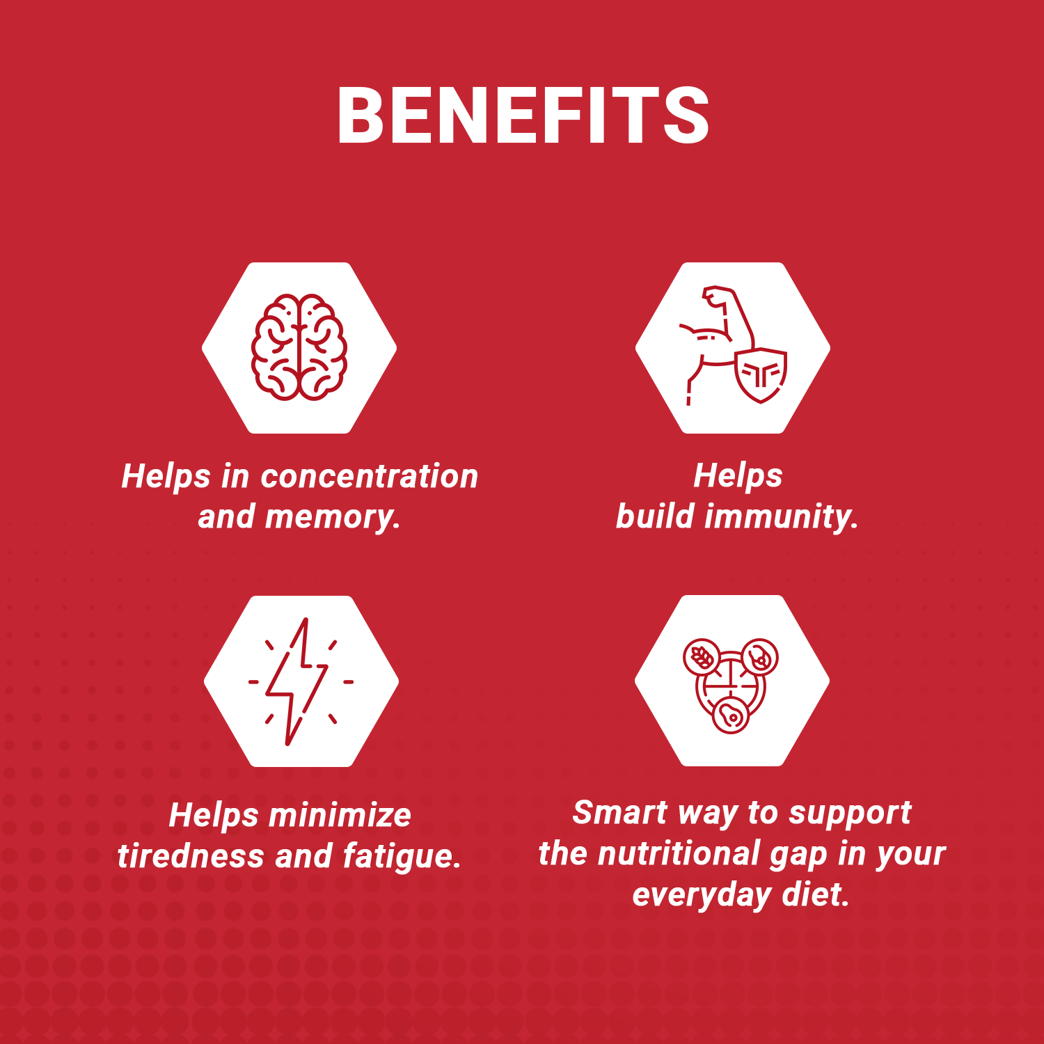 Blend of more than 13 essential vitamins and minerals to supplement your daily diet.
