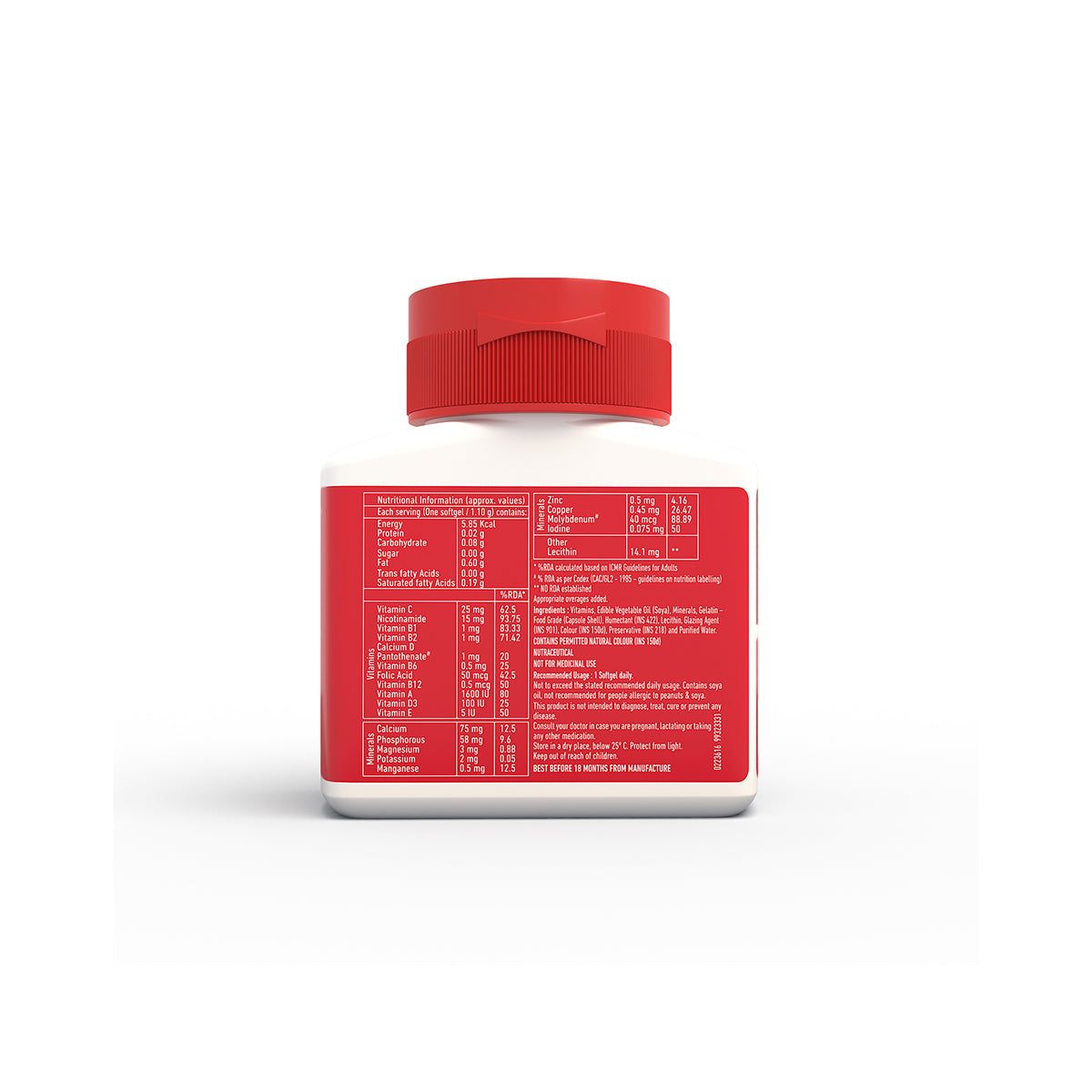 Vehicle (Soya Oil), Gelatin - Food Grade, Minerals^^, Humectant (INS 422), Vitamins, Lecithin, Glazing Agent (INS 901), Natural Food Colour (INS 150d), Preservative (INS 218) and Purified Water.